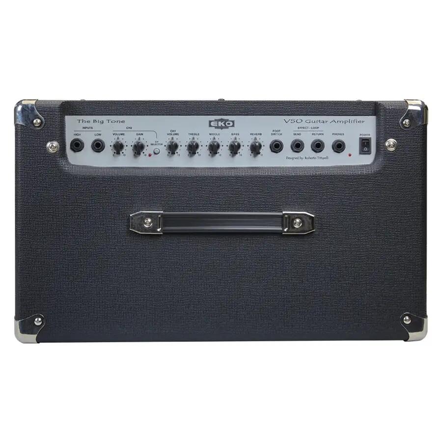 EKO V 50R è un combo dall'ottimo rapporto qualità prezzo che unisce la storia del brand marchigiano al genio tecnico di Roberto Tittarelli, per dar vita ad un amplificatore 2 canali da 50watt dedicato alla chitarra elettrica. Integrato in un cabinet con cono custom da 12" ed equipaggiato di un riverbero a molla, l' EKO V 50R fissa i suoi punti di forza nella qualità timbrica, che vi permetterà di spaziare fra diversi suoni grazie alla sensibilità delle sue regolazioni, e nella versatilità che favorisce l'uso dell'ampli in diversi ambienti e situazioni: live, studio, casa. Il tutto in maniera compatta e leggera, per poter trasportare l'ampli senza problemi ovunque vogliate.